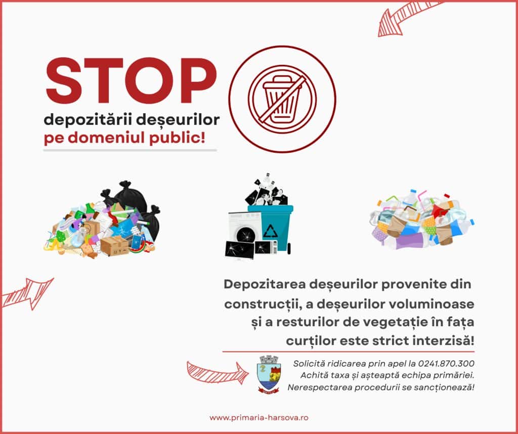 🛑 „Nu scoateți gunoiul din gospodărie înainte de aprobarea ridicării!”, avertizează reprezentanții administrației. Este interzisă depozitarea deșeurilor pe domeniul public ori în locuri neamenajate, iar abandonarea lor constituie contravenție și se sancționează cu amenzi considerabile.