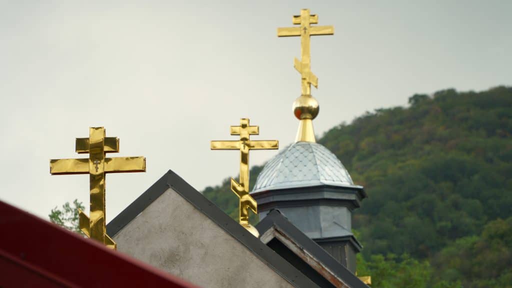 Un loc aparte în inima dobrogenilor rușilor lipoveni îl ocupă Mănăstirea Uspenia — își deschide porțile pentru femei doar la marile sărbători. „Uspenia pentru noi, dobrogenii, este un fel de Mecca”, spune una dintre tinerele ansamblului. „Este locul în care ne întâlnim rușii lipoveni din întreaga Dobroge.” O sărbătoare care e, în același timp, slujbă, masă sfântă și bucurie colectivă — de la copiii care aleargă în jurul bisericii, frumos îmbrăcați, până la bătrânii care stau drepți în strană.