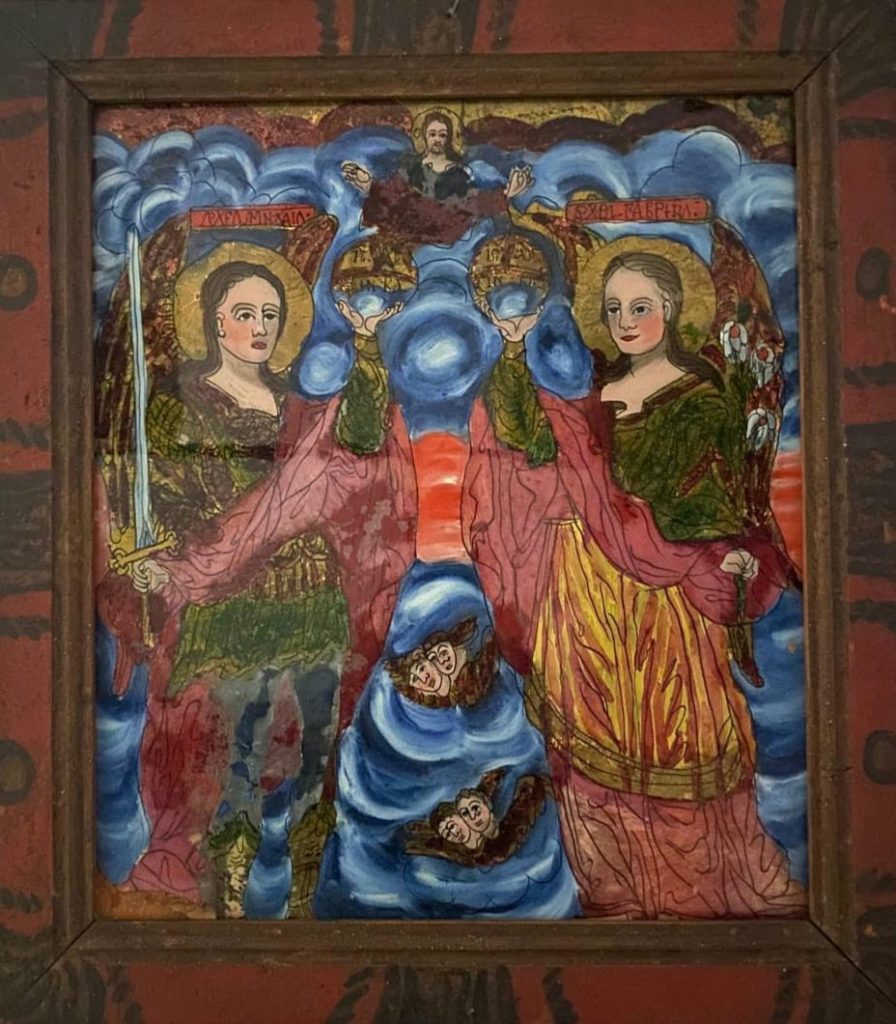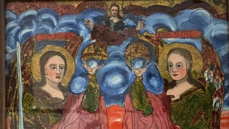 În imagine, Sfinții Arhangheli Mihail și Gavriil într-o icoană țărănească pictată pe sticlă în secolul al XIX-lea, la Mărginimea Sibiului, de către meșterul iconar Ion Morar (1815-1890). Icoana poate fi admirată în expoziția permanentă a Muzeului de Artă Populară.