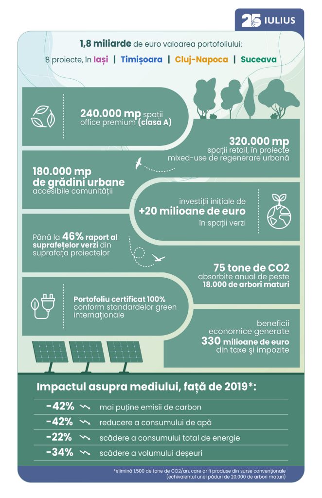 Proiectele IULIUS sunt concepte sustenabile, care integrează grădini ample, aducând natura în mijlocul orașelor, între oameni – 18 hectare de grădini urbane în Iași, Timișoara, Cluj-Napoca şi Suceava, cu 80.000 de arbori și arbuști. Prin conceptele lor, investițiile companiei își aduc aportul nu doar la dezvoltarea urană și economică, ci și din perspectivă culturală și socială, devenind destinații ce oferă experiențe variante, pentru toate vârstele, tot timpul anului – peste 1.000 de evenimente anual, inclusiv ca parteneriate cu mediul artistic și cultural local.