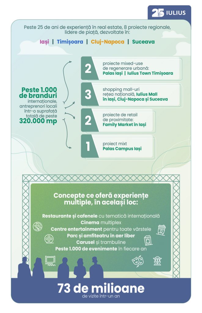 IULIUS marchează un sfert de secol, perioadă în care compania a redefinit standardele din retailul românesc și a contribuit semnificativ la transformarea urbană a marilor orașe din țară. Cu o viziune integrată asupra dezvoltării sustenabile și a mixului dintre shopping, business, natură și lifestyle, IULIUS a devenit un reper în industria de real estate nu doar în țară, ci și în Europa de Est. De la primul mall din afara Capitalei, inaugurat la Iași, în 2000, compania a dezvoltat 2 proiecte mixed-use, 3 shopping mall-uri sub rețeaua Iulius Mall, 2 proiecte de retail de proximitate – Family Market și un proiect mixt office + retail – Palas Campus. Proiectele cumulează peste 73 milioane de vizite pe an, iar varietatea de branduri, evenimente, restaurante și cafenele, centre de entertainment și diverse servicii le-a transformat în adevărate destinații. Mai multe despre rețeaua de retail pot fi aflate aici (https://www.youtube.com/watch?v=0A-I2tPVIJA).